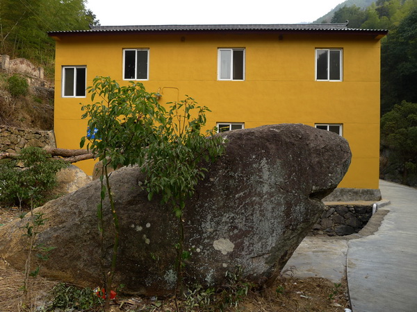隨著水泥臺(tái)階蜿蜒而上,一刻鐘后便到了赤師廟,廟名赤師,不知何意。赤師廟前,新修了一座寬大的供行人休息的廊屋,廊屋大概是行善者捐助修建,屋內(nèi)豎有一塊石碑,碑上刻有樂(lè)助人的姓名和款項(xiàng)。廊屋前臥有一塊巨巖,形似癩蛤蟆,俗稱“蛤蟆巖”。過(guò)了赤師廟后的小橋往上,便沒(méi)了水泥臺(tái)階,而都是“原生態(tài)”的碎石村道,路邊不時(shí)可見(jiàn)塊石壘砌的石墻斷垣。據(jù)有關(guān)資料記載,白云山上先后有井墩、鳳陽(yáng)、新安、下士、小滴水、窩麻巖等七個(gè)自然村。其中井墩村,有20多戶人家,離水磨坑