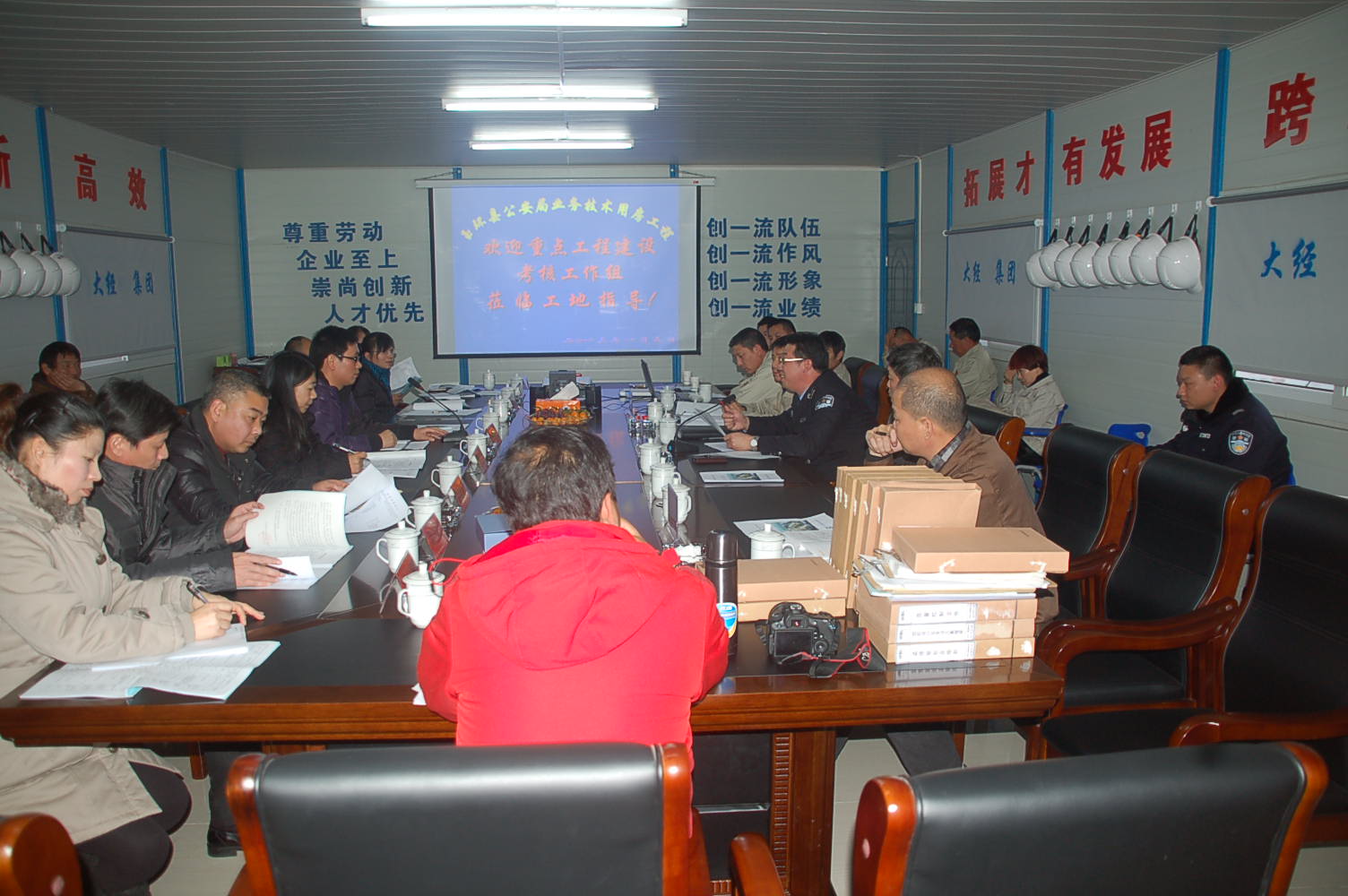 浙江大經(jīng)建設(shè)集團(tuán)玉環(huán)縣公安局業(yè)務(wù)技術(shù)用房工程項目部現(xiàn)場經(jīng)理陶定寶向蒞臨領(lǐng)導(dǎo)和專家就本工程的施工組織、人機配備、場區(qū)布置、質(zhì)量控制、進(jìn)度實施與計劃、安全與文明施工措施落實、業(yè)主監(jiān)理施工三方的配合等綜合情況進(jìn)行了匯報,同時也通過VCR向考核工作組展示了現(xiàn)場的實際狀態(tài),項目部的前期工作得到了考核組領(lǐng)導(dǎo)們的肯定。