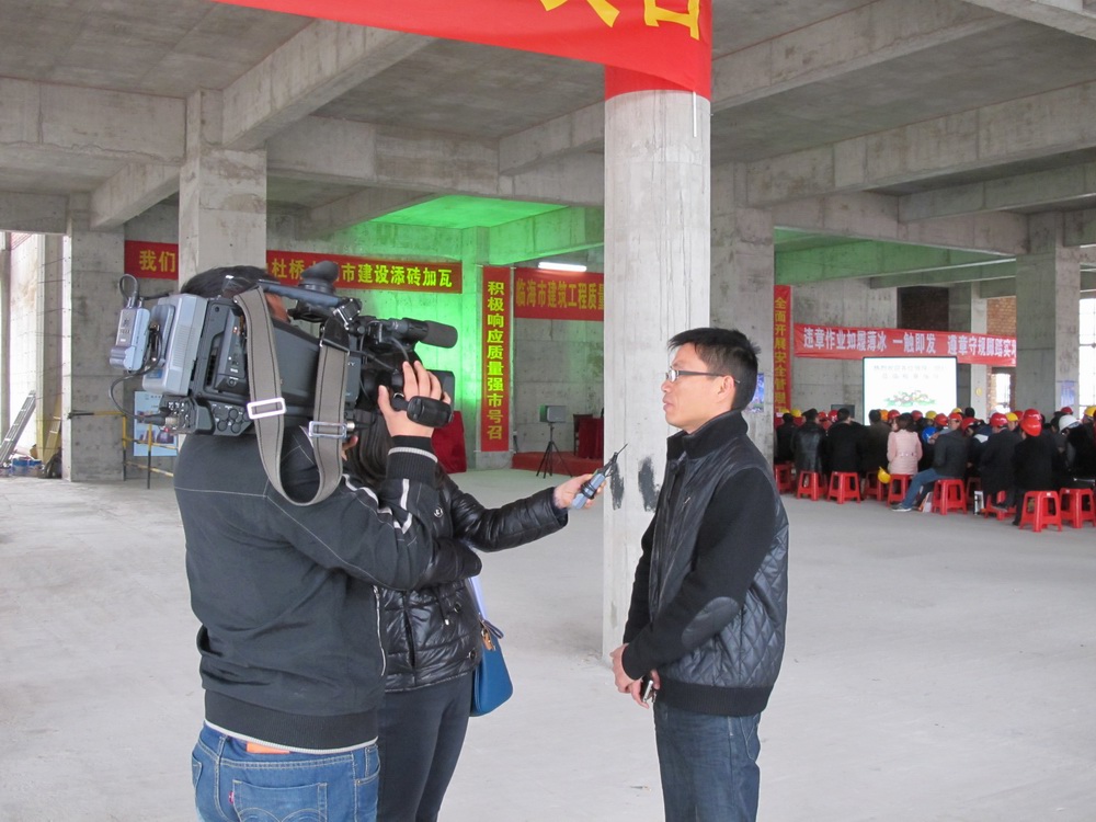 現(xiàn)場(chǎng)會(huì)時(shí),臨海電視臺(tái)的記者采訪了市建筑工程質(zhì)量監(jiān)督站站長(zhǎng)葉青同志和我公司副總經(jīng)理王國(guó)棉同志。葉青同志認(rèn)為東部很多工程項(xiàng)目都是招商引資過來的,大多是外地的建設(shè)單位和施工單位,對(duì)我們當(dāng)?shù)匕踩芾硪?guī)定不是很熟悉,以這個(gè)工地為標(biāo)桿,開展樹標(biāo)桿學(xué)標(biāo)桿活動(dòng)旨在提高東部區(qū)塊施工現(xiàn)場(chǎng)的管理水平。王國(guó)棉同志著重介紹了該工程安全方面的一些亮點(diǎn),如臨邊防護(hù)、電梯井、洞口防護(hù)都采用定型化、工具化的產(chǎn)品。工程現(xiàn)場(chǎng)布置人性化,特別是在三樓預(yù)埋構(gòu)造柱的鋼筋周邊加了圓形保護(hù)筒,一則防止對(duì)鋼筋的破壞,二則安全防護(hù),防止人不小心踩上去。